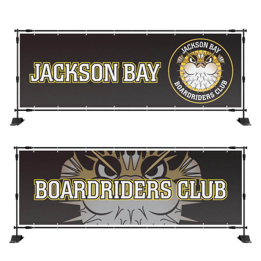 Design of feather flags for board riders including illustration (left) and board rental advertisement (right)